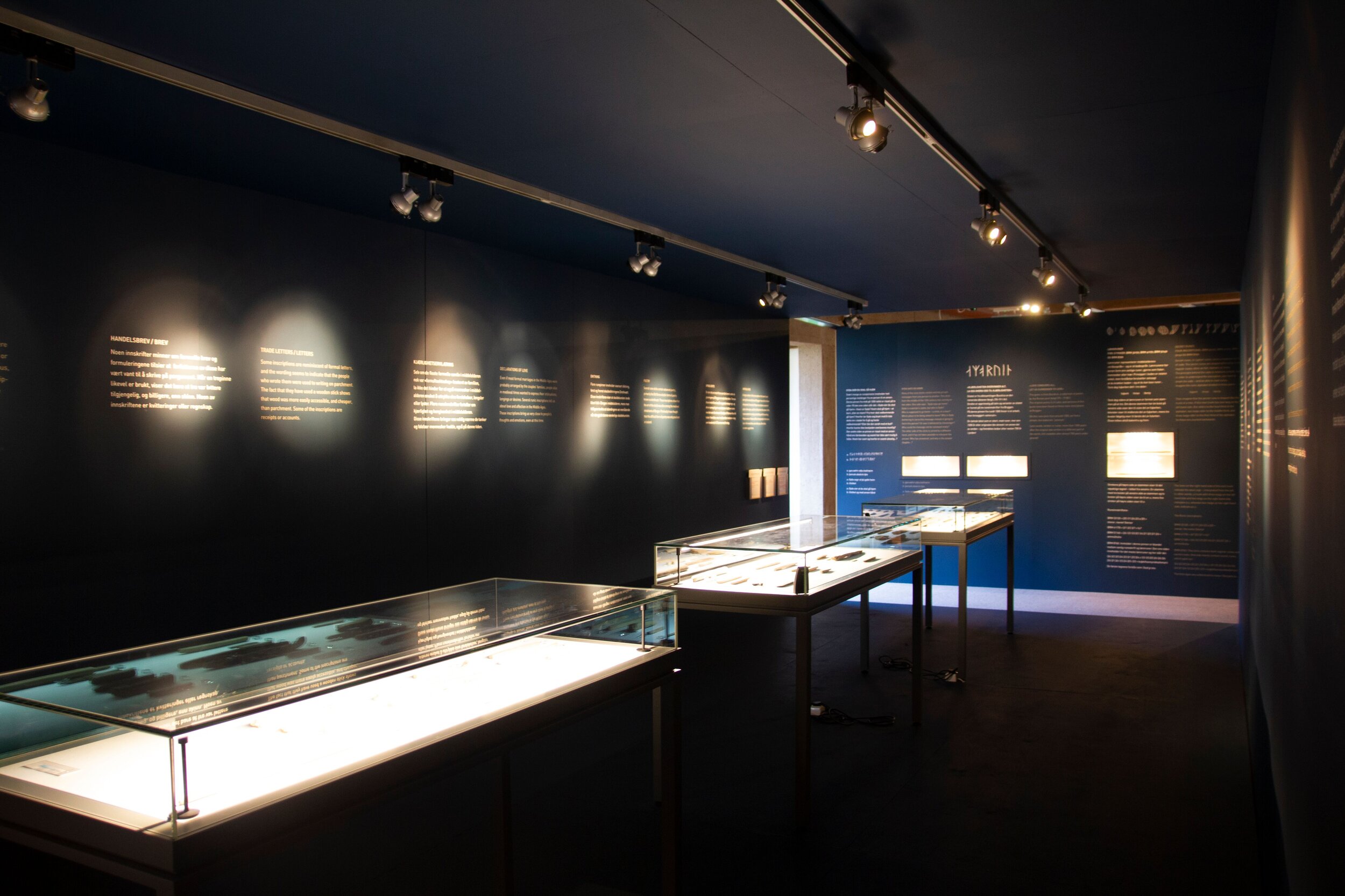 Mellomalderarkeologisk utstilling om runematerialet i Bergen og omegn. Forarbeid til ny basisiutstilling på Bryggens Museum. Runepinnane er sårbare for lys og krev stabil luftfuktigheit. Ei utfordring var at utstillingsrommet har dagslys. For å skjerme for lys laga vi ein stor boks i rommet, vi ville at publikum skulle få kjensle av å gå inn i eit eige univers. Blåfargen kom til med tanke på dette. Montrene er spesialbestilt og er av materialar som ikkje kan skada gjenstandane over tid. Dei har eit kammer for silicagel, mengde og type av denne er med å halde luftfukta stabil og i ei viss prosent. Utforminga er gjort i samarbeid med utstillingsarkitekt Rune Kvam og grafisk designar Tine Fuglseth.