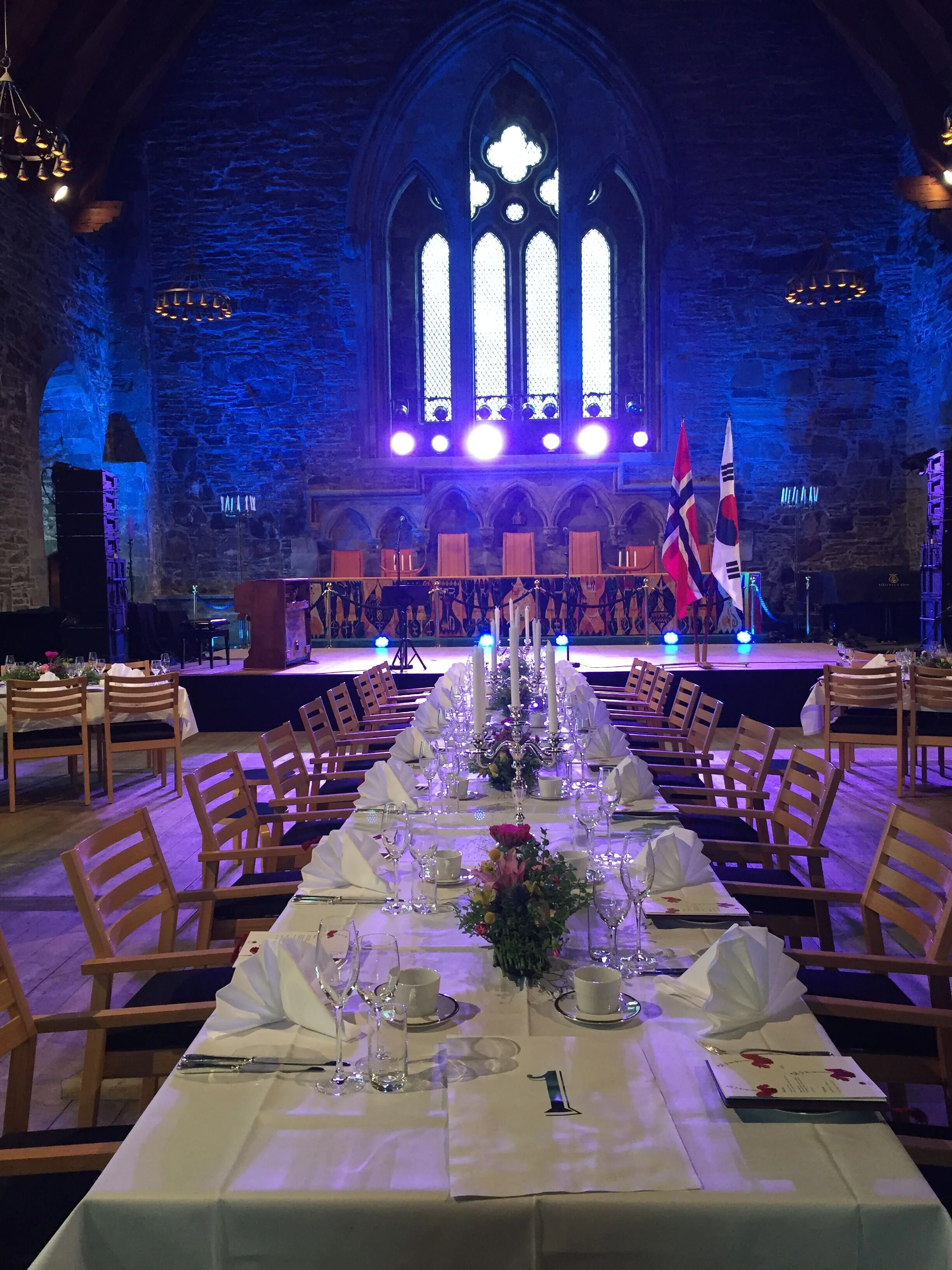 Håkonshallen i Bergen er ein bygning med ei historie som strekk seg tilbake til mellomalderen, dette måtte vi ha med oss i tankane når Bymuseet i Bergen endeleg fekk pengar til nye stolar til Håkonshallen. Det var på tide å byte ut dei gamle stolane for lengst, men pengane til nye stolar kom ikkje før stolen til forsvarsministeren knakk under ei tilstelling. Kriteriane for dei nye stolane var at dei skulle passa godt inn i hallen reint estetisk, dei måtte kunne stablast, skulle vera god å sitje i, ha god kvalitet, kunne byte delar på, ha vaskbart trekk, skulle vera med og utan armlener og fungere til middagar, konsertar og andre arrangementer. Det vart ein lang prosess med anbudsrundar, visning av stolar og tildeling. Stolen som vann var Modus stablestol produsert av Helland og designa av Fredrik Torsteinsen. Stolen hadde det meste av det vi ynskte oss. Den er også robust og stødig og passar godt til eikegolvet. Vi valgte svarte stolputar då vi ville oppnå eit røft preg som samstundes skulle vera diskre for ikkje å konkurrera med andre freda element. I tillegg til pengar til stolar fekk ein ei gåveforsterking, denne vart mellom anna brukt til nye benkeputar og stolputar nede.