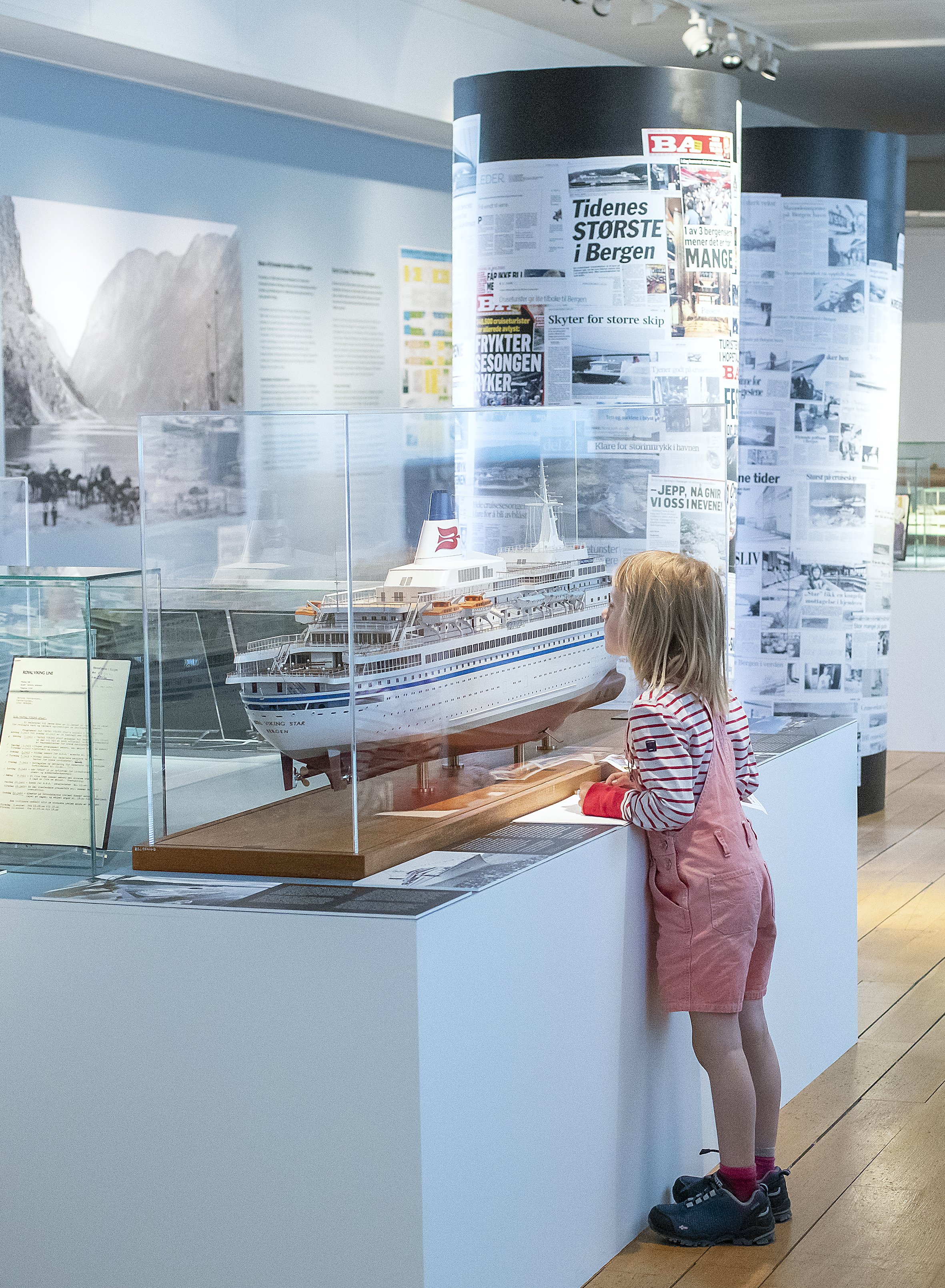 Bergens Sjøfartsmuseum: Ny temporær utstilling, tema: Cruisebyen Bergen, Prestegård Design var utstillingsarkitekt og utvikla utstillingskonseptet i samarbeid med museet. Grafisk design og produksjon tekst/bilete Reklamehuset AS. Utstilling ferdigstilt juni 2021. Oppdragsgjevar: Museum Vest. Foto: Silje Katrin Robinson